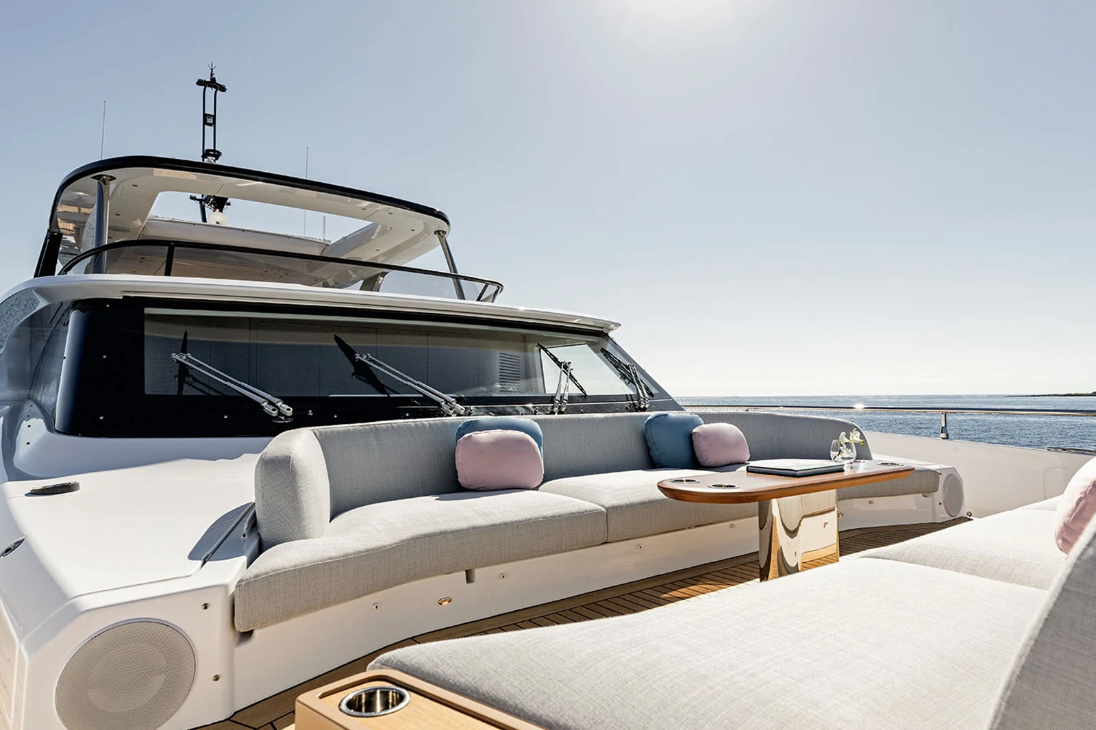 The proposition met an enthusiastic reception right from the start, with 22 units of the Grande 26M already sold. When it refers to a yacht, the term ‘super’ identifies specific characteristics, which the Grande 26M delivers through smart design choices that reflect the expectations of demanding owners in terms of the onboard experience: 5 cabins, including the full-beam owner’s suite on the main deck, and completely separated guest and crew flows. These distinctive features and the huge flybridge – 50m2 all on the same level – have never been seen before on a yacht this size. In the words of Alberto Mancini, the designer of the Grande 26M’s exteriors: “The project was driven by the enthusiasm to create a compact superyacht, with five cabins, an enormous flybridge and a larger cockpit than usual for the category, which we wanted to extend to give the yacht a fullyfledged dining area overlooking the water.”