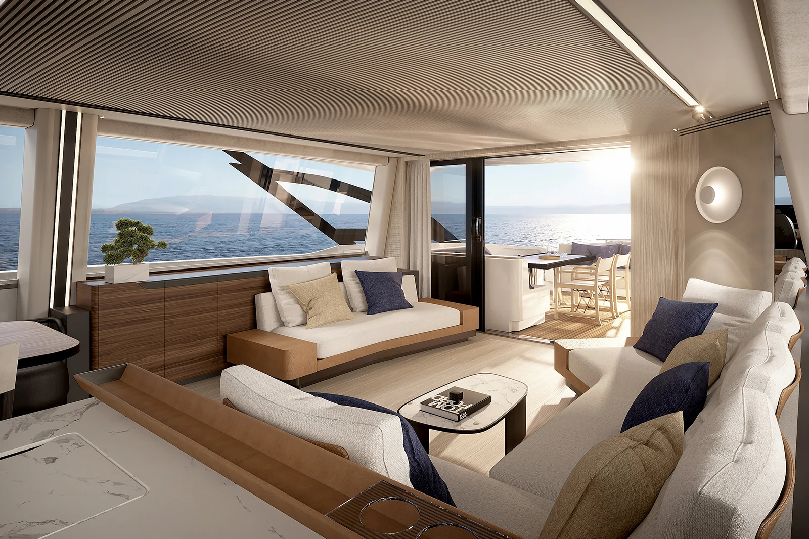 The compact design of its engine room creates space for a layout never before seen in this category, with a generous living zone between the exterior and interior, a completely separate galley, four roomy cabins and a spacious garage which can house a tender and jet ski.