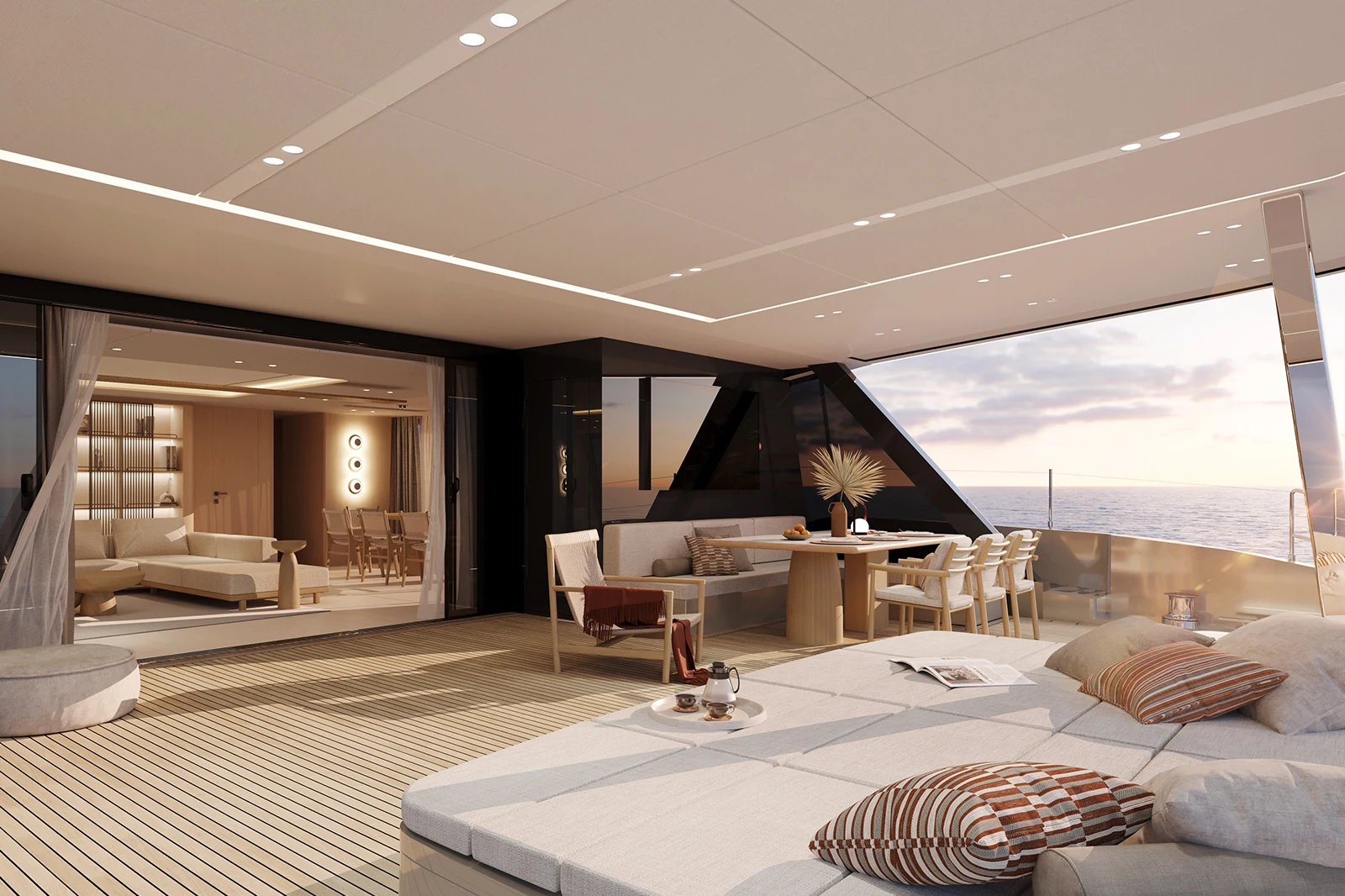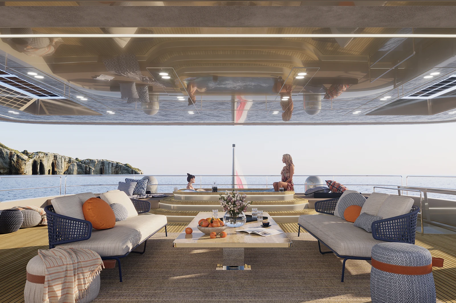 Jedan od definisanih elemenata jahte od 100 stopa je njen prostrani i inovativni Ocean Lounge — prepoznatljiv po dizajnerskom jeziku Sunreef NEXT. Krmeni deo jahte pažljivo je redizajniran i sada uključuje nevidljivu garažu sposobnu da smesti dva jet-skija i širok spektar vodenih rekvizita. Integrisan ispod luksuzne, redizajnirane sofe, ovaj skriveni sistem za odlaganje optimizuje prostor bez narušavanja estetskog sklada lounge-a.